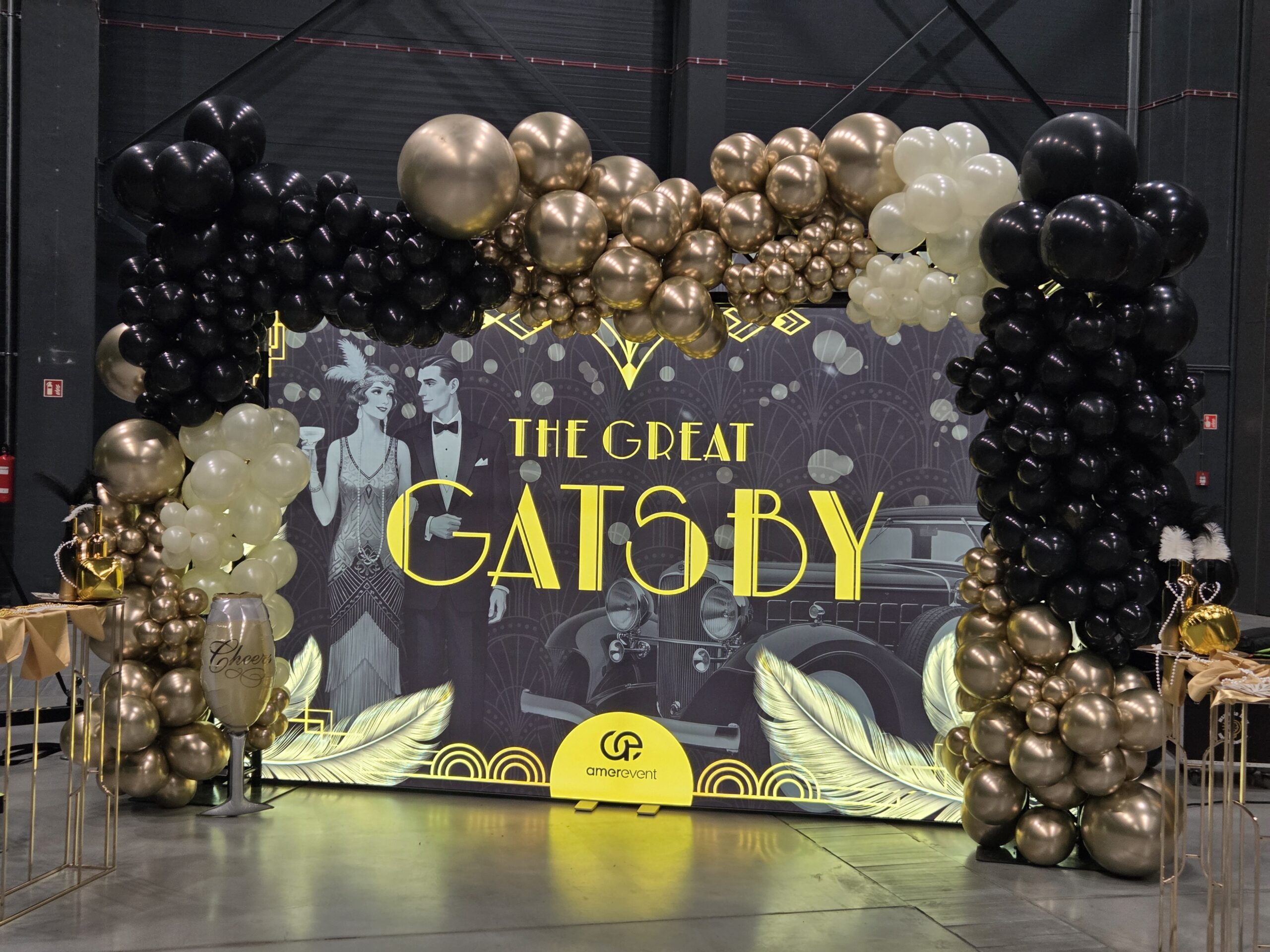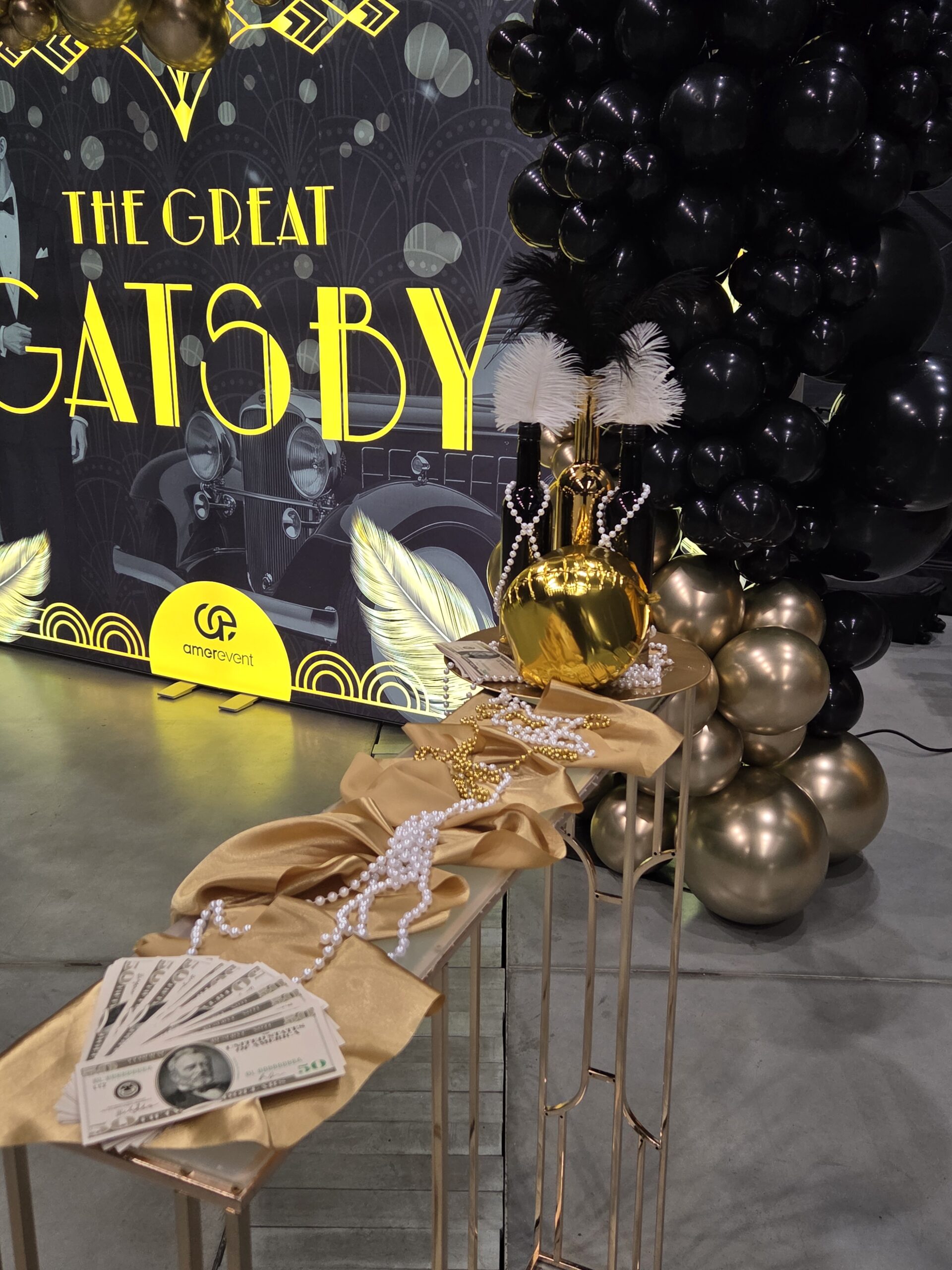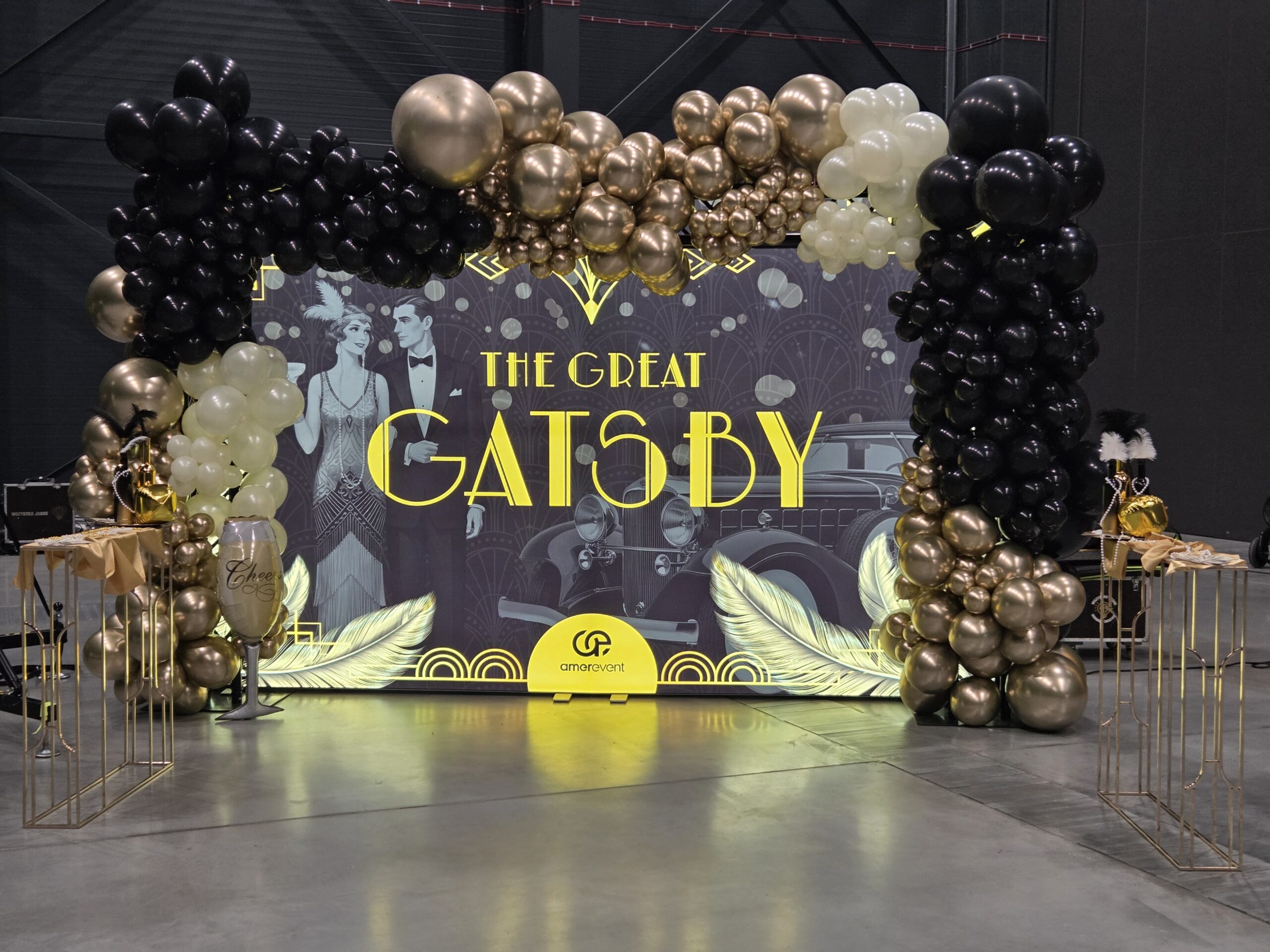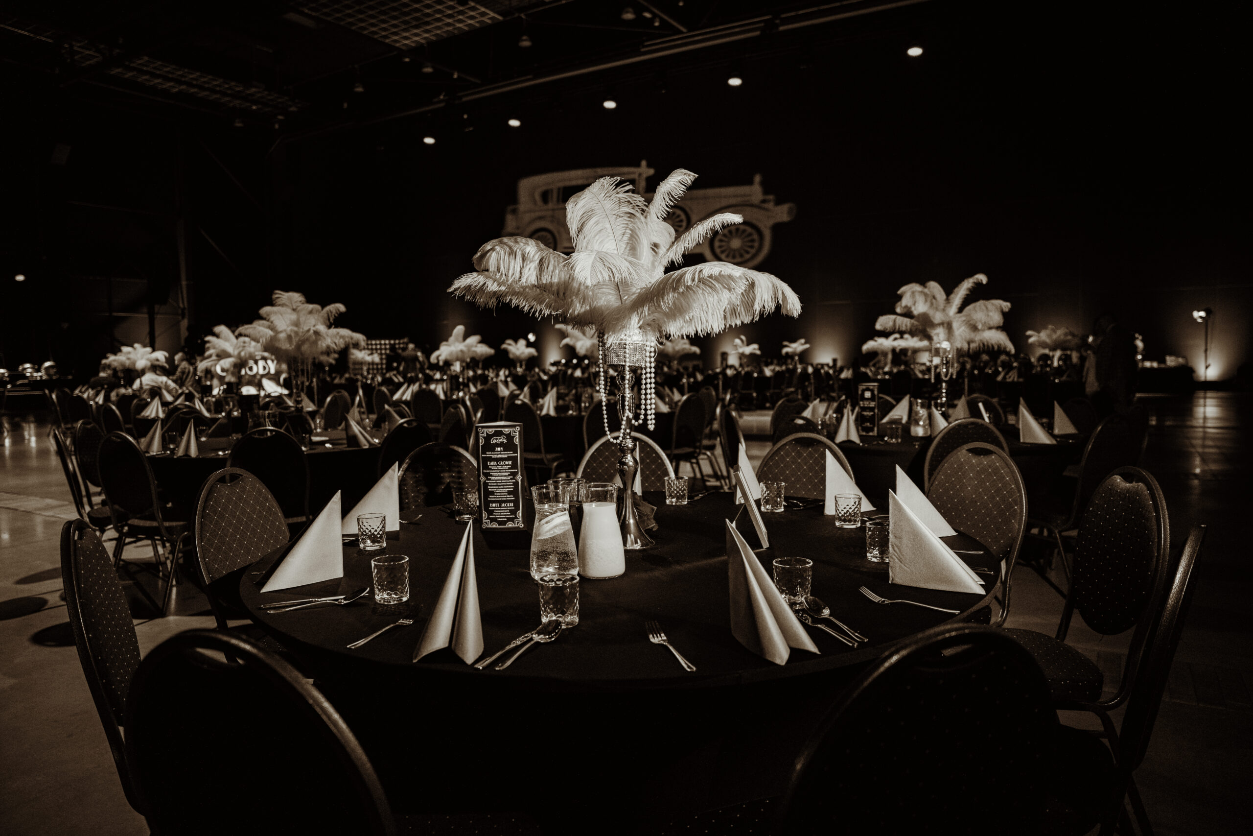 Na gości czekała efektowna fotościanka balonowa, przyciągająca spojrzenia i obiektywy aparatów. Jedna ze ścian ożyła dzięki projekcji kultowego Rolls-Royce’a, symbolu bogactwa i stylu Gatsby’ego. Stoły natomiast wyglądały jak przeniesione z ekskluzywnego bankietu sprzed stu lat. Pióra, eleganckie dodatki i subtelne nawiązania do art déco budowały klimat z niezwykłą precyzją.