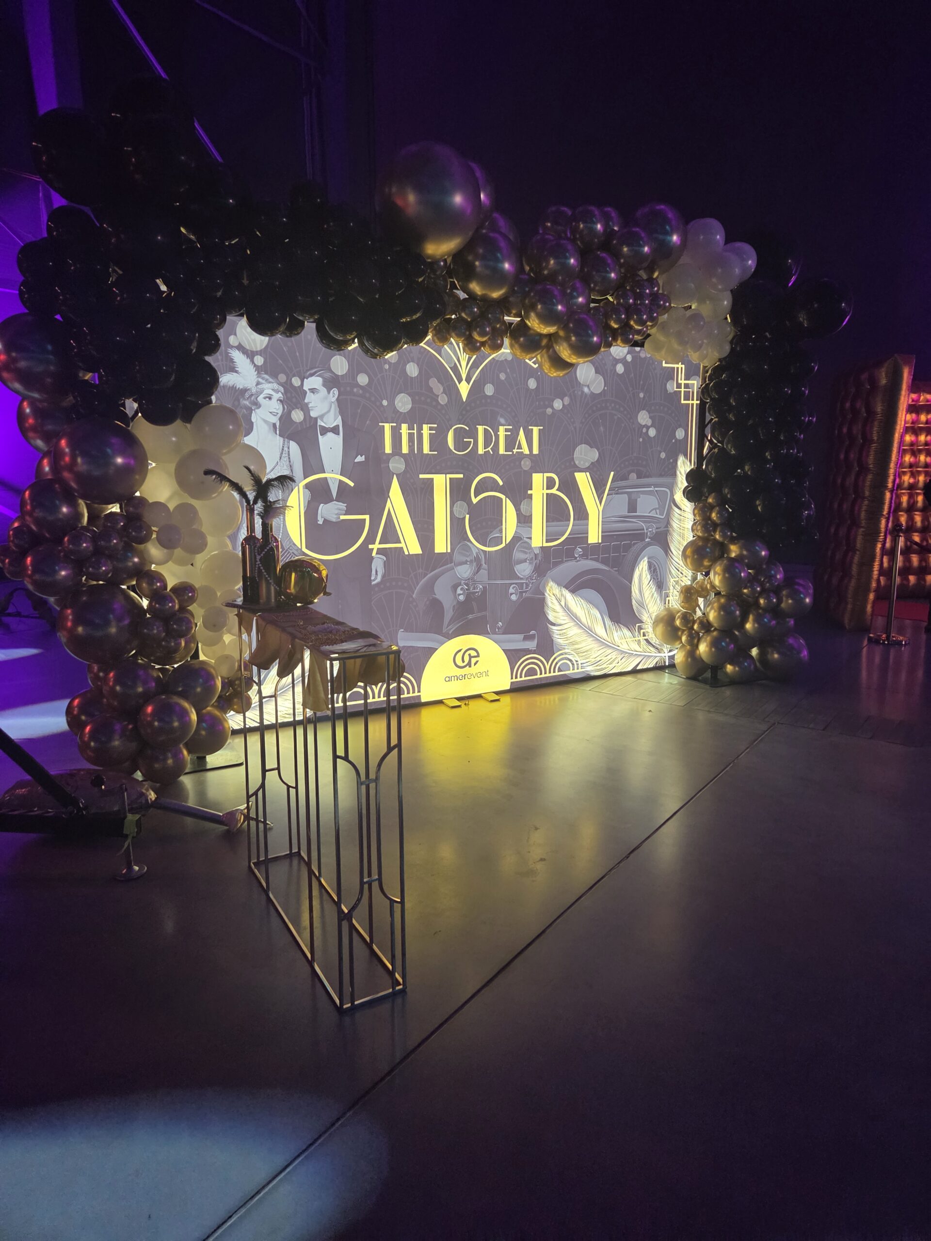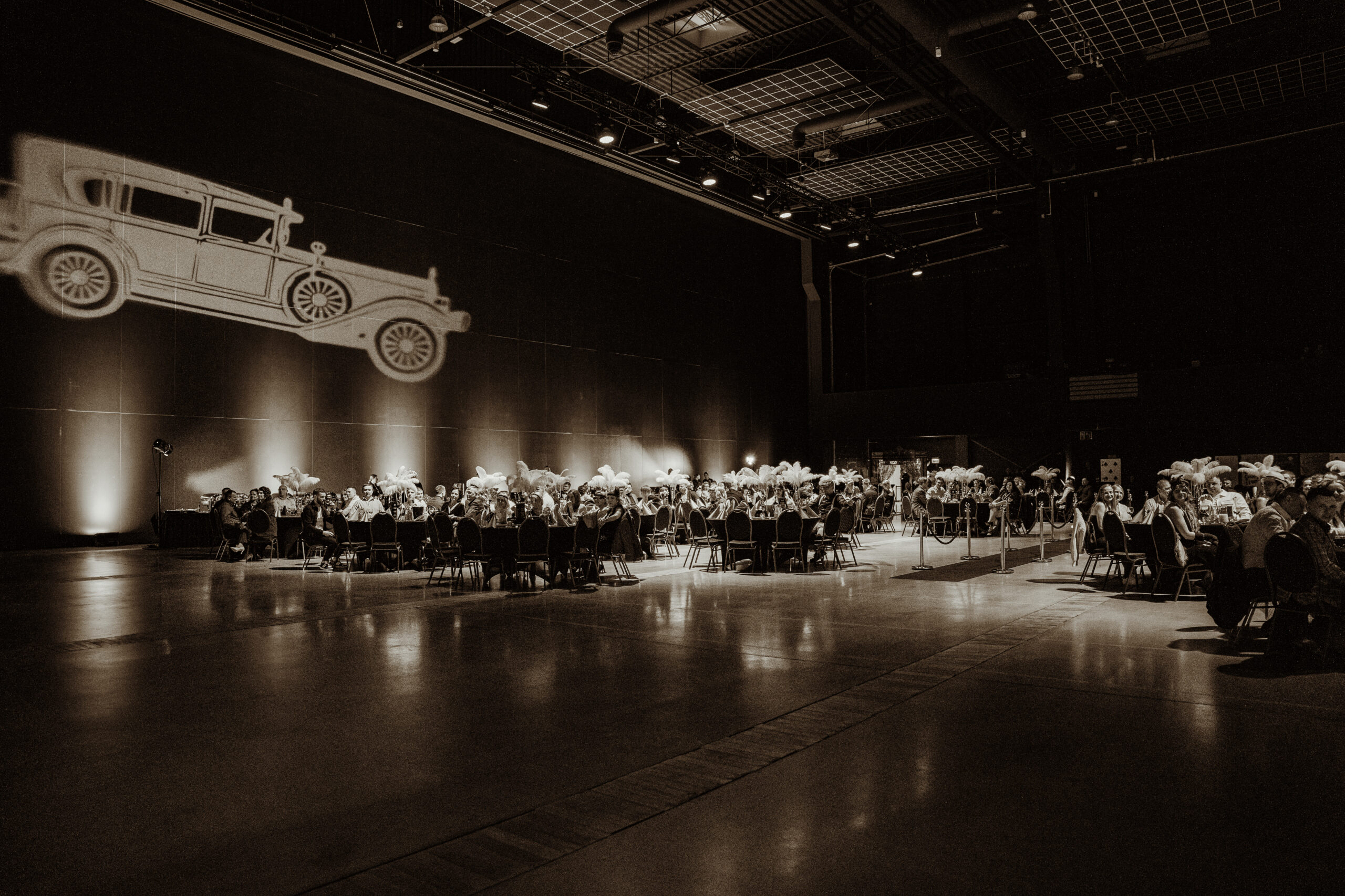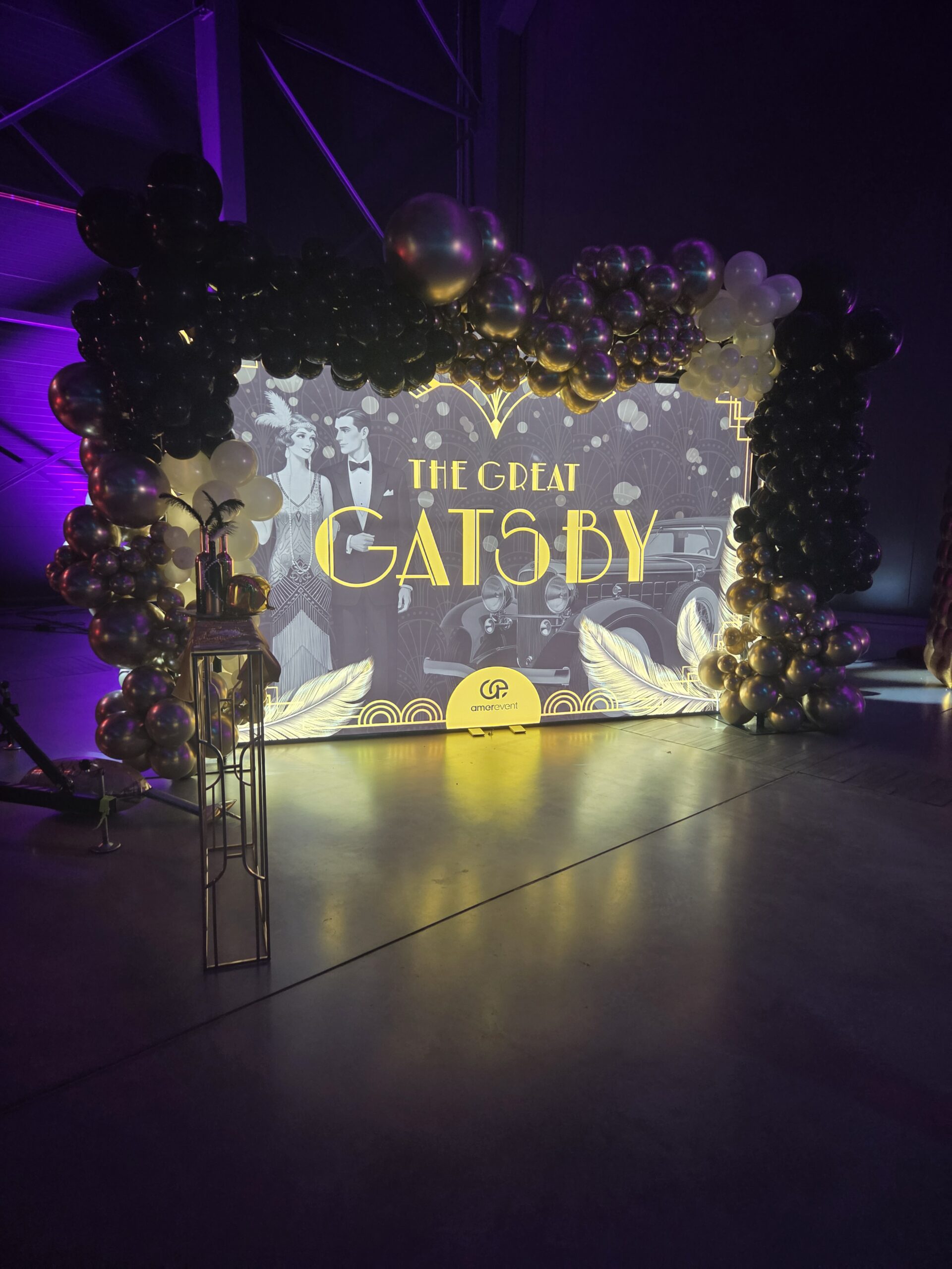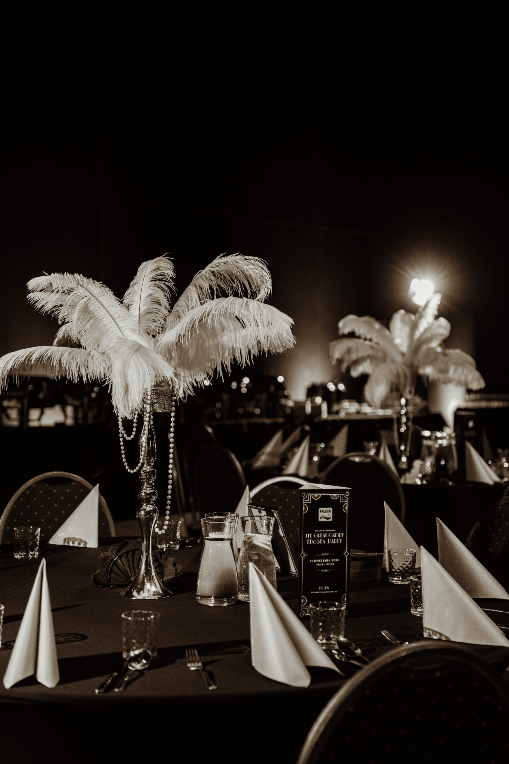 Na gości czekała efektowna fotościanka balonowa, przyciągająca spojrzenia i obiektywy aparatów. Jedna ze ścian ożyła dzięki projekcji kultowego Rolls-Royce’a, symbolu bogactwa i stylu Gatsby’ego. Stoły natomiast wyglądały jak przeniesione z ekskluzywnego bankietu sprzed stu lat. Pióra, eleganckie dodatki i subtelne nawiązania do art déco budowały klimat z niezwykłą precyzją.
