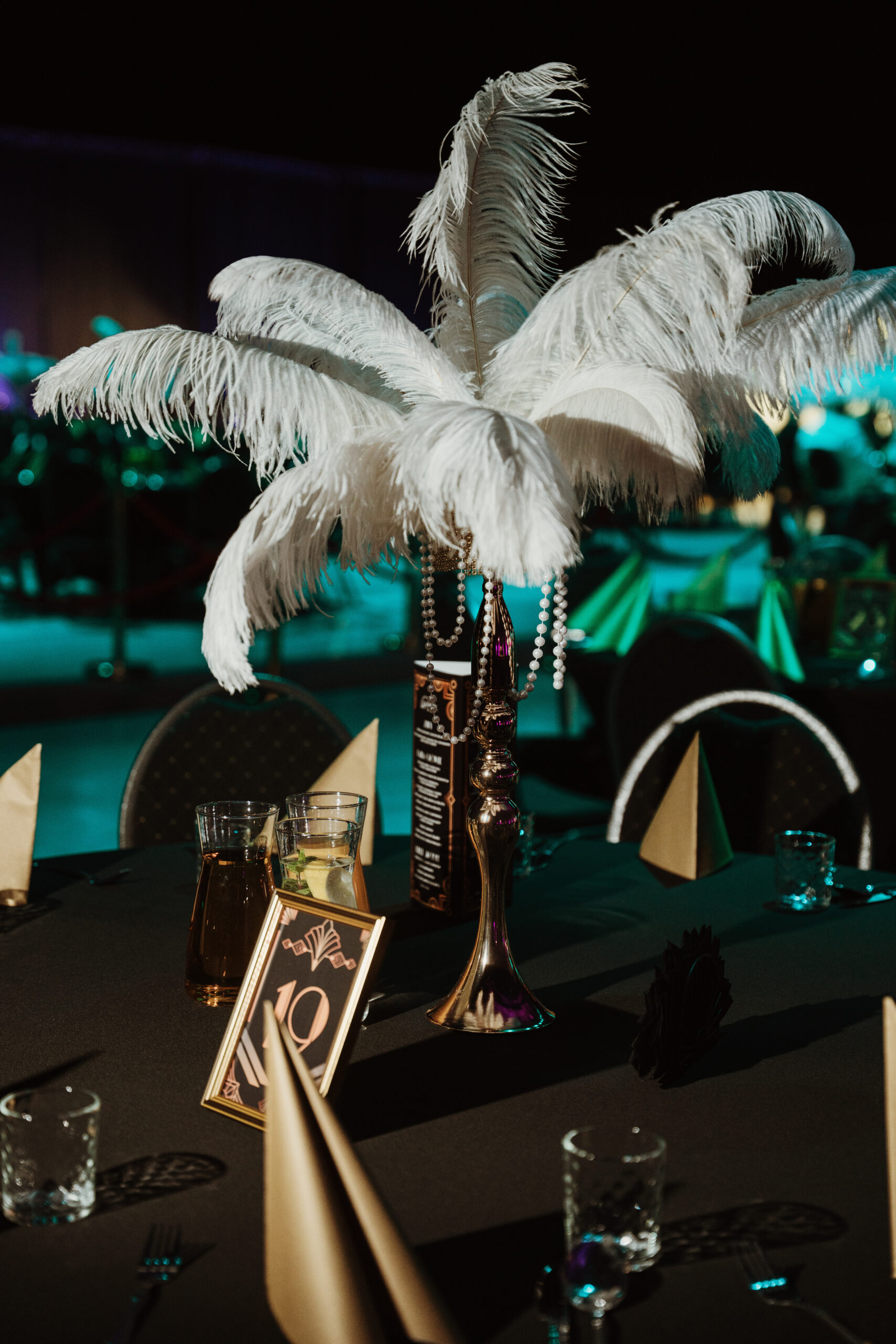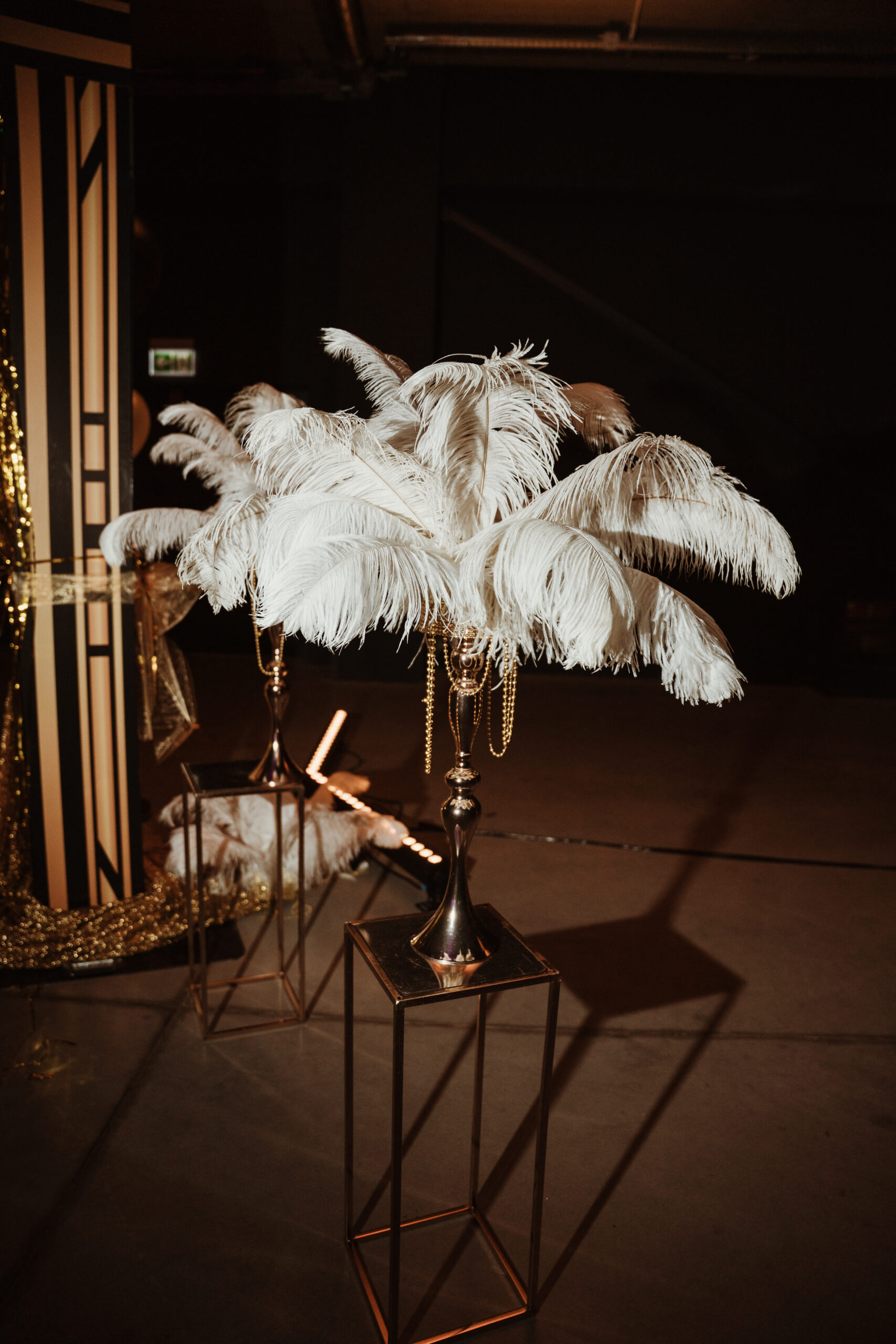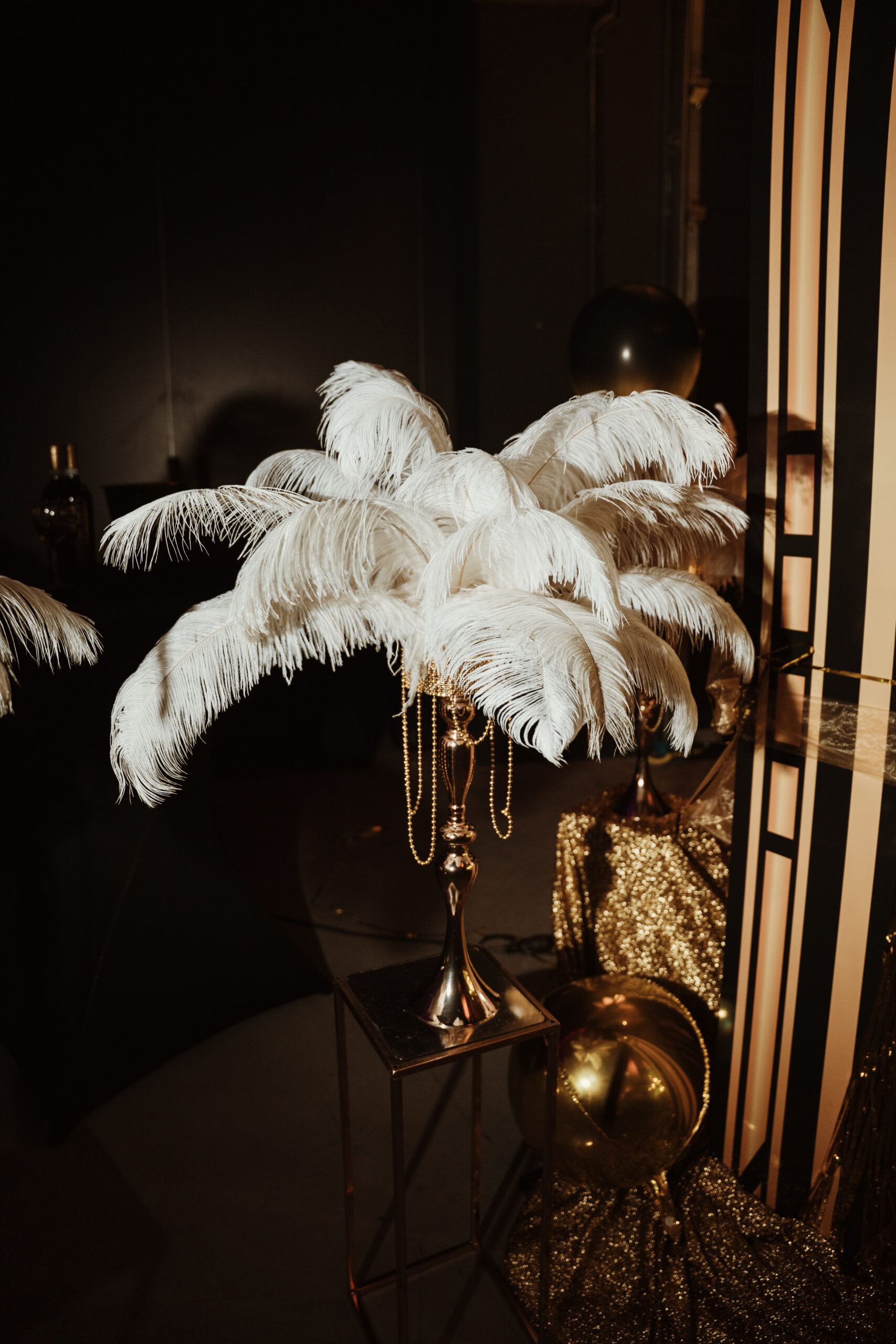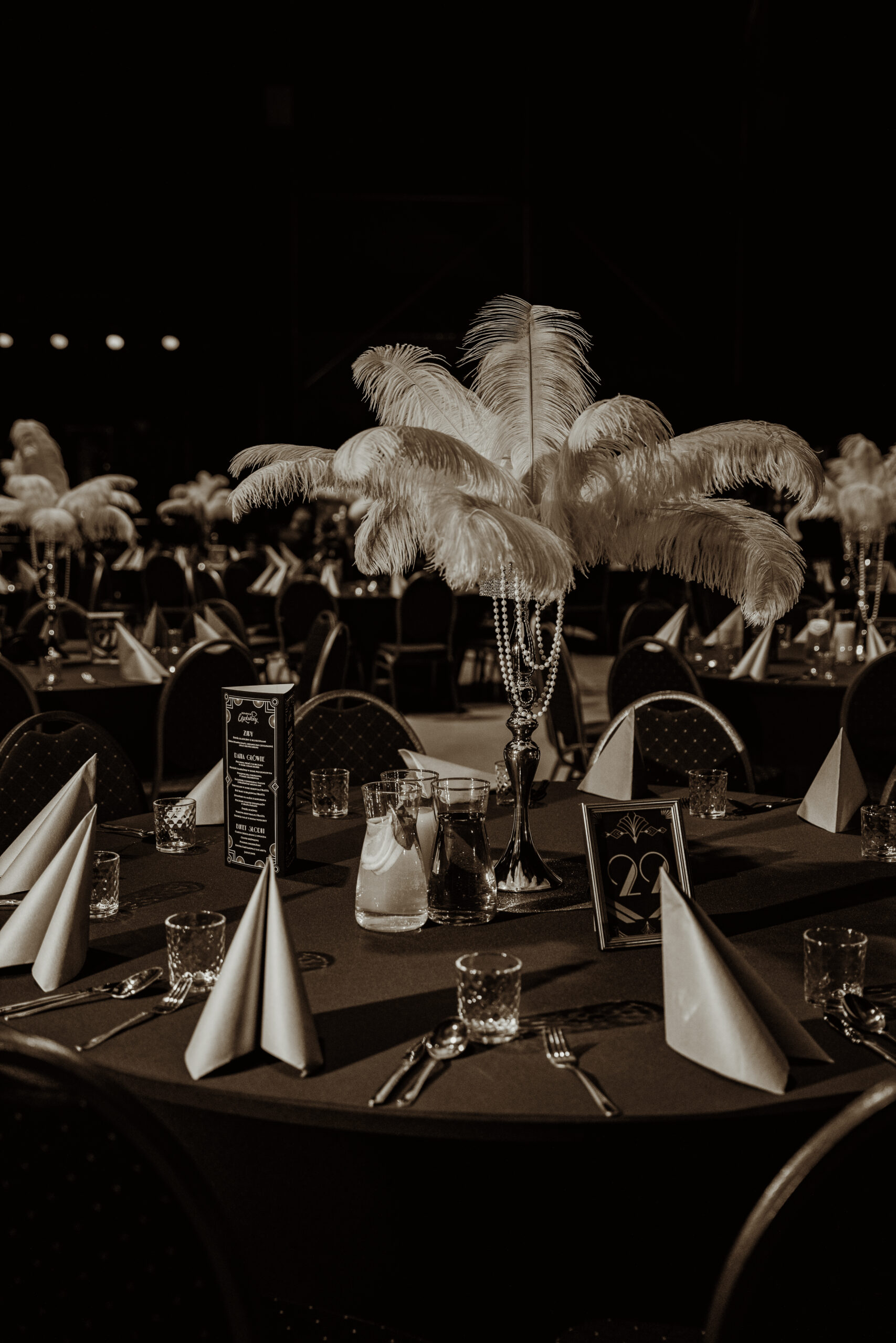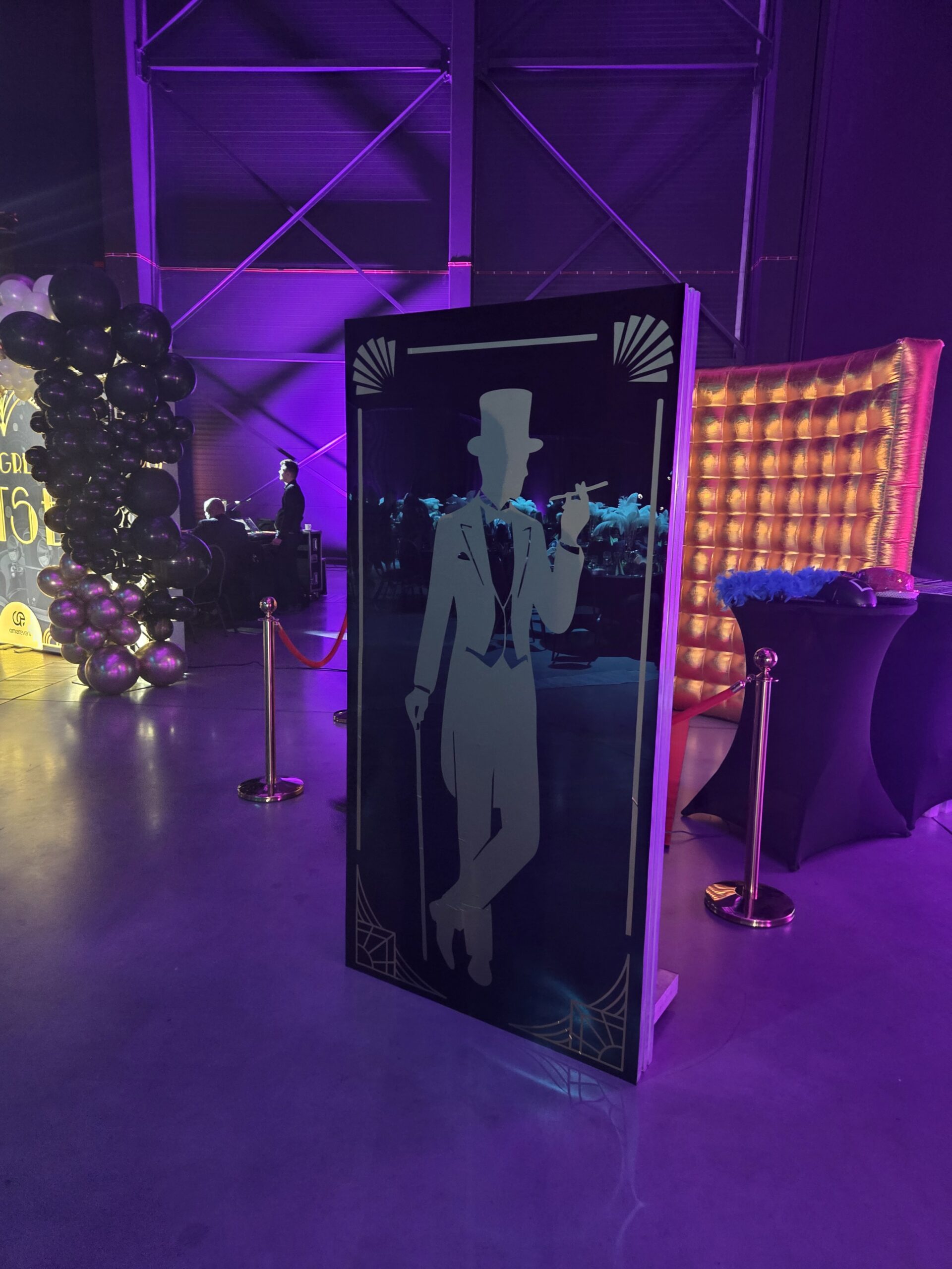 Na gości czekała efektowna fotościanka balonowa, przyciągająca spojrzenia i obiektywy aparatów. Jedna ze ścian ożyła dzięki projekcji kultowego Rolls-Royce’a, symbolu bogactwa i stylu Gatsby’ego. Stoły natomiast wyglądały jak przeniesione z ekskluzywnego bankietu sprzed stu lat. Pióra, eleganckie dodatki i subtelne nawiązania do art déco budowały klimat z niezwykłą precyzją.
