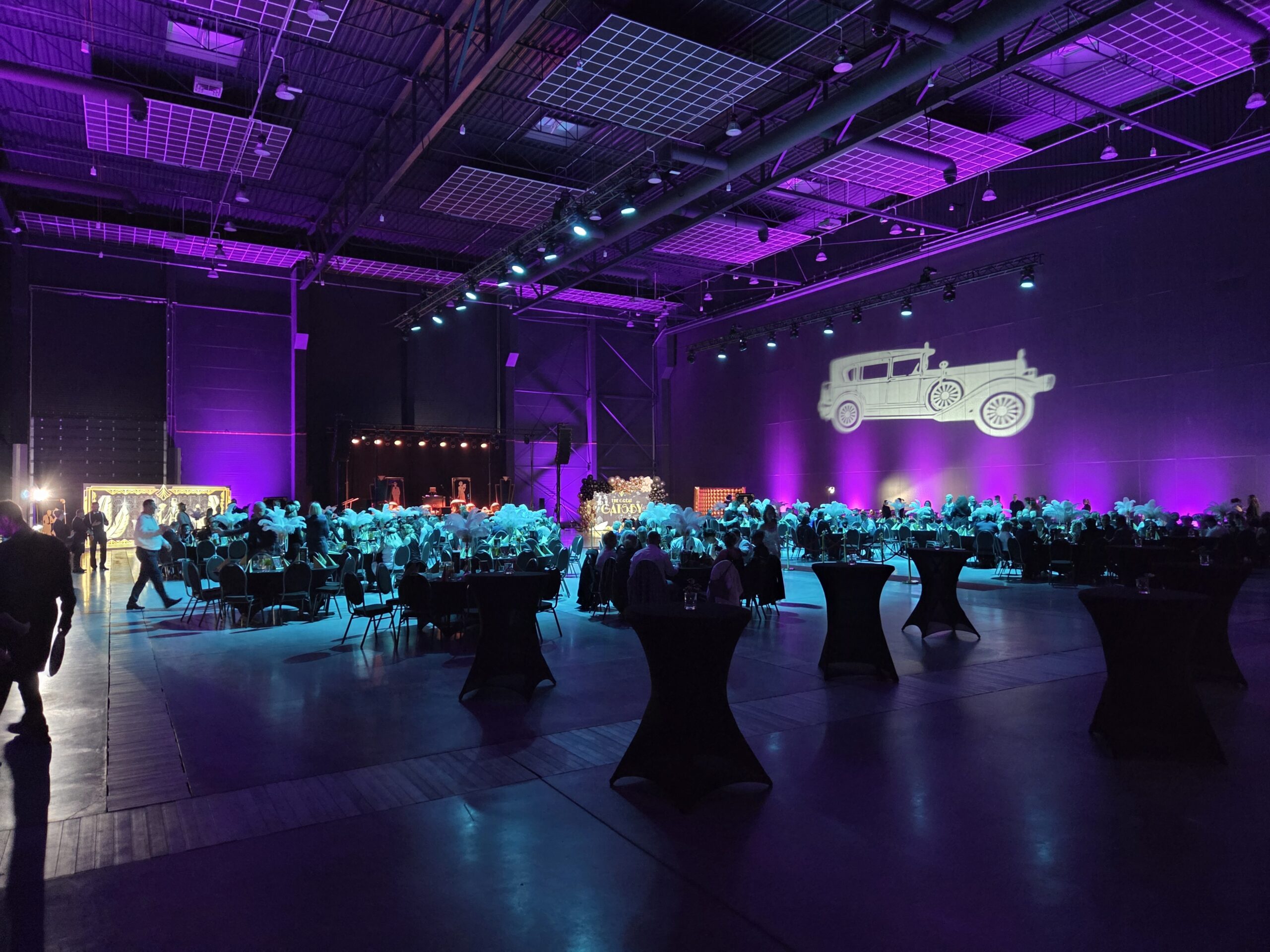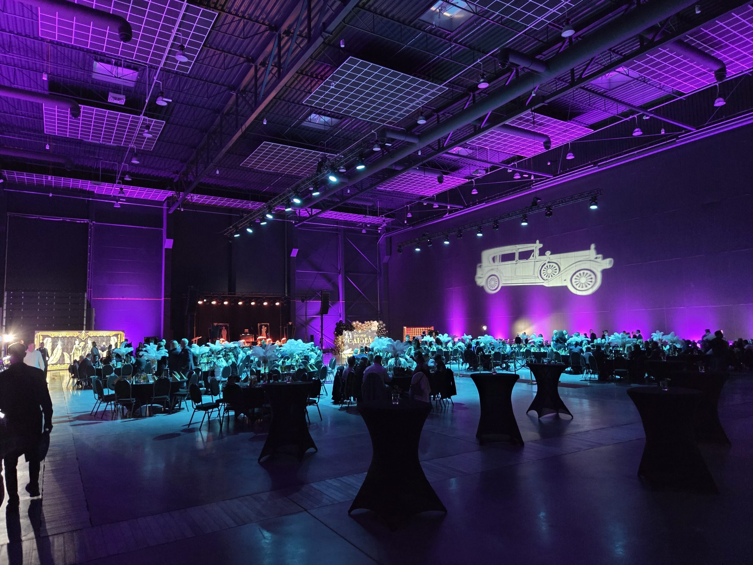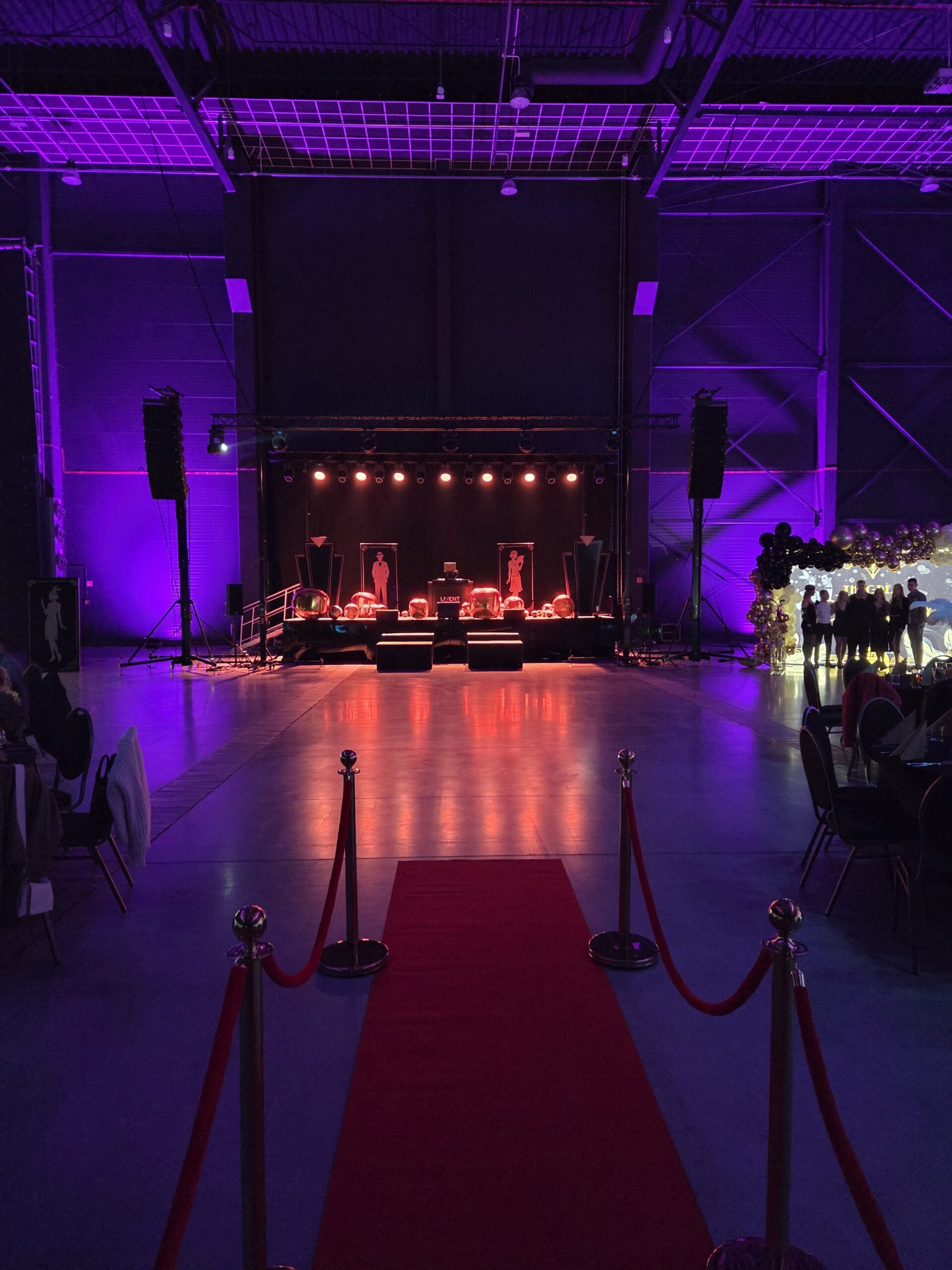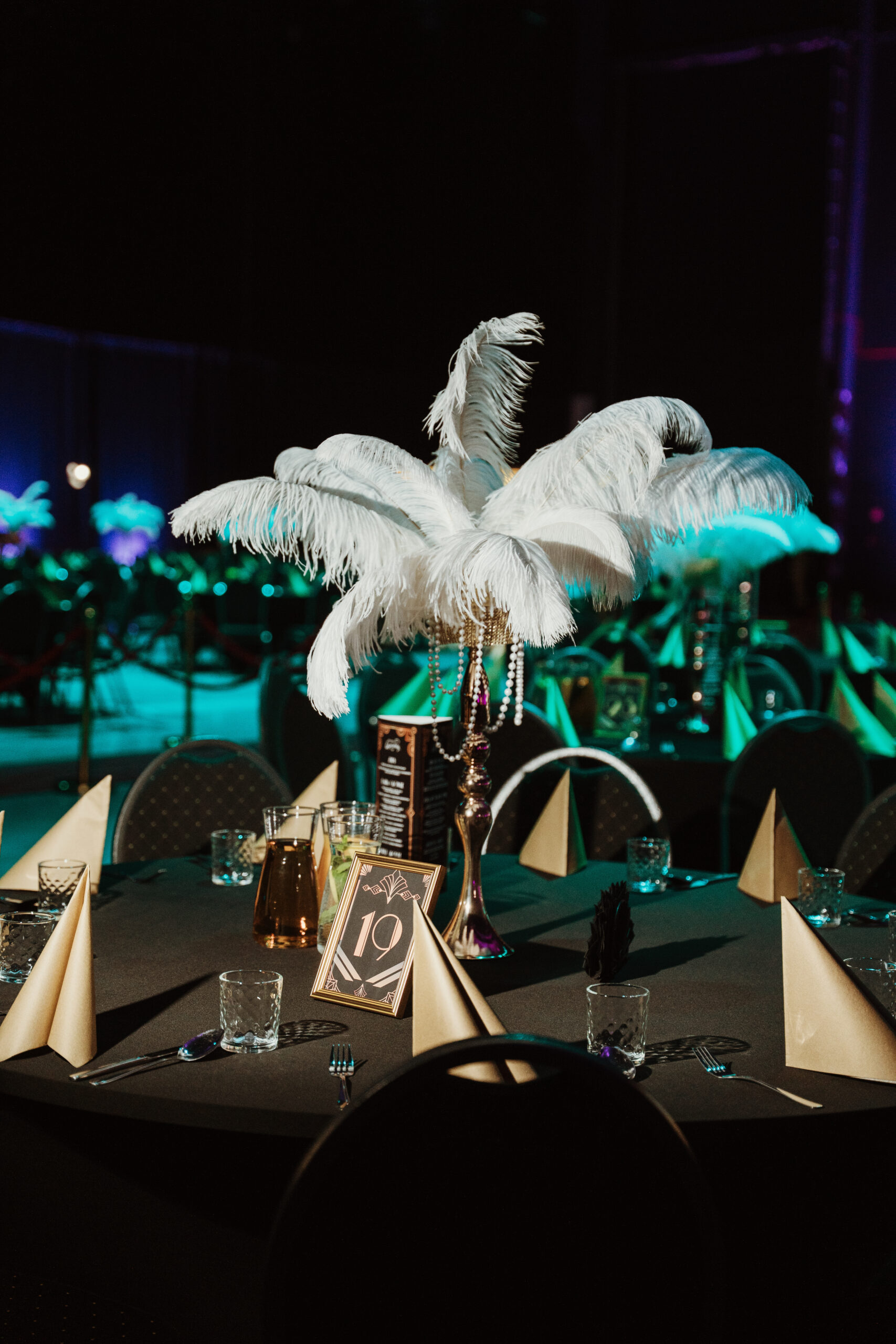 Na gości czekała efektowna fotościanka balonowa, przyciągająca spojrzenia i obiektywy aparatów. Jedna ze ścian ożyła dzięki projekcji kultowego Rolls-Royce’a, symbolu bogactwa i stylu Gatsby’ego. Stoły natomiast wyglądały jak przeniesione z ekskluzywnego bankietu sprzed stu lat. Pióra, eleganckie dodatki i subtelne nawiązania do art déco budowały klimat z niezwykłą precyzją.