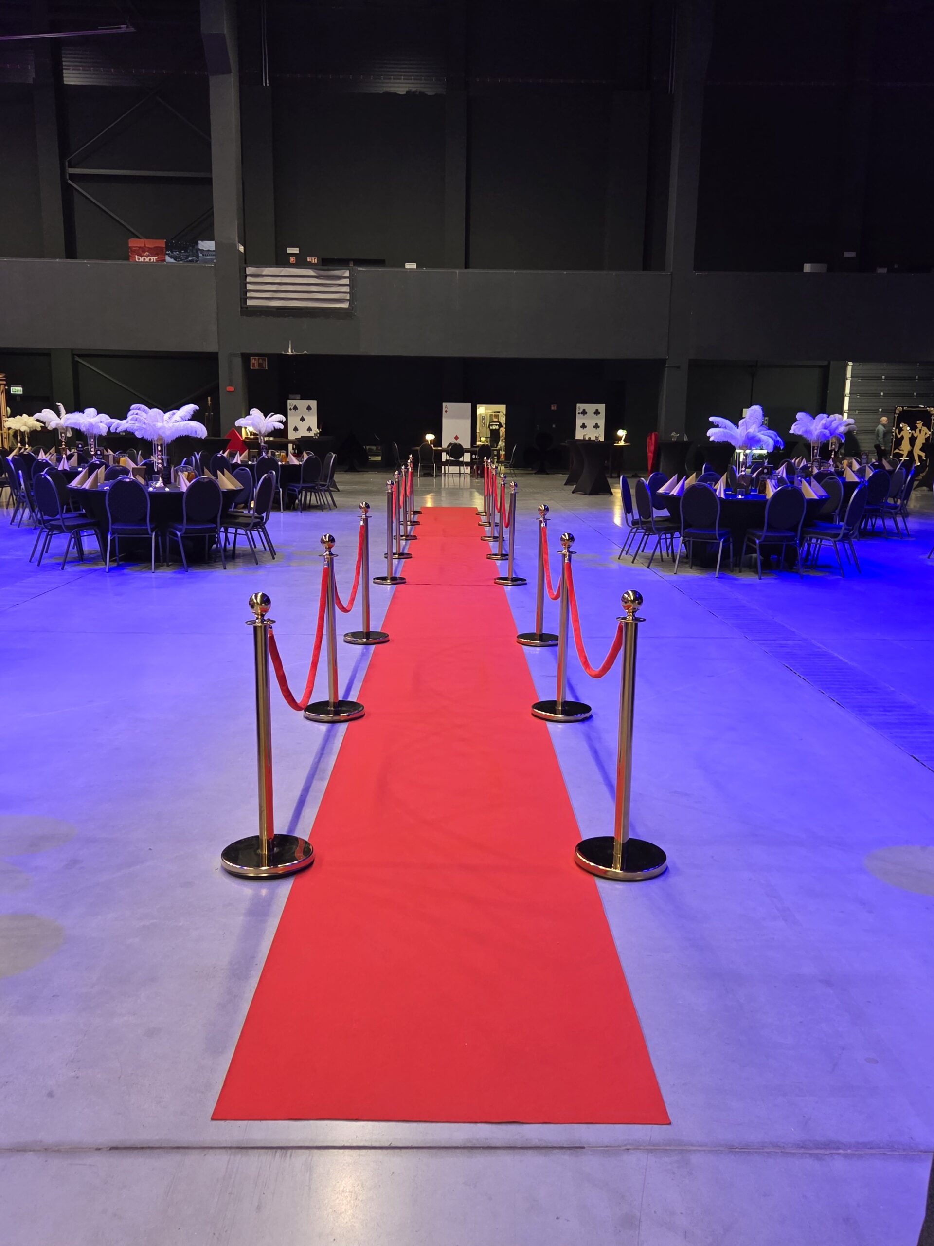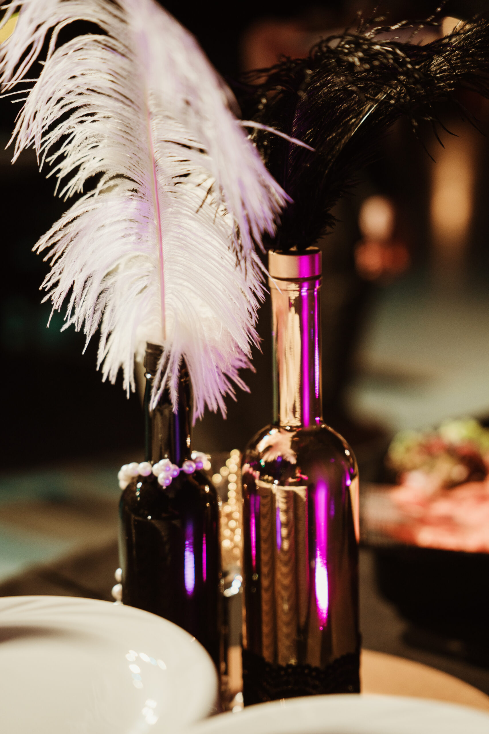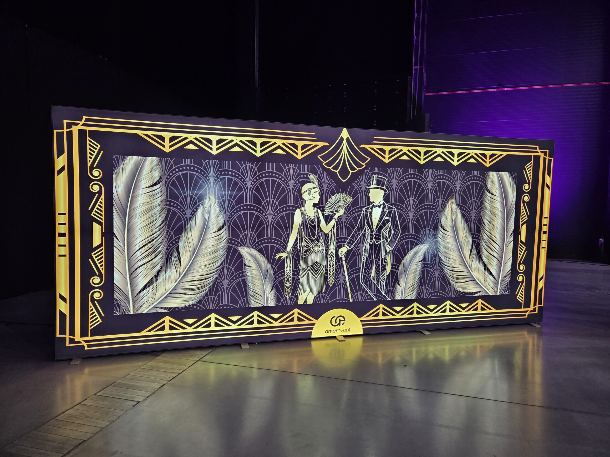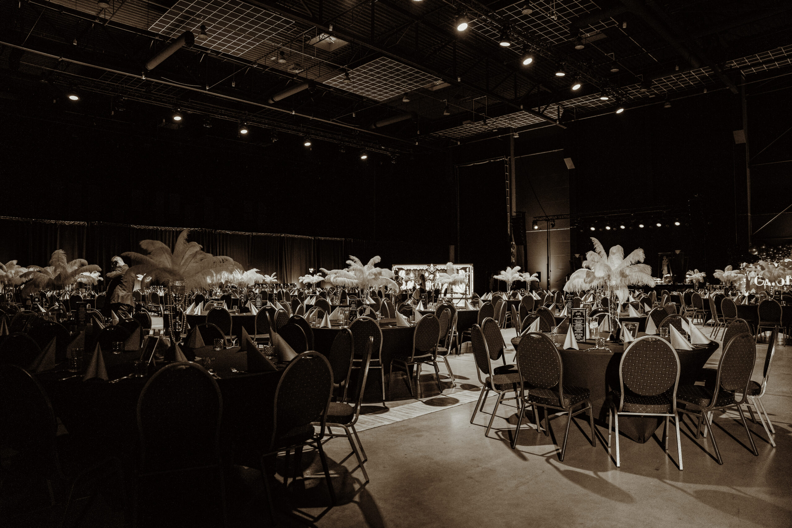 Na gości czekała efektowna fotościanka balonowa, przyciągająca spojrzenia i obiektywy aparatów. Jedna ze ścian ożyła dzięki projekcji kultowego Rolls-Royce’a, symbolu bogactwa i stylu Gatsby’ego. Stoły natomiast wyglądały jak przeniesione z ekskluzywnego bankietu sprzed stu lat. Pióra, eleganckie dodatki i subtelne nawiązania do art déco budowały klimat z niezwykłą precyzją.