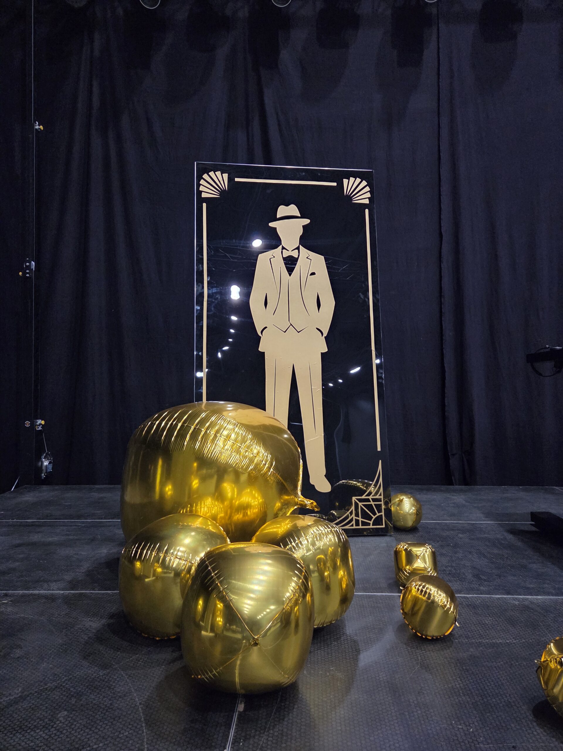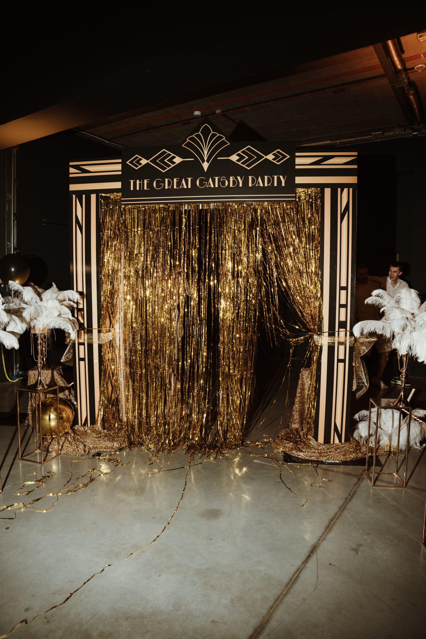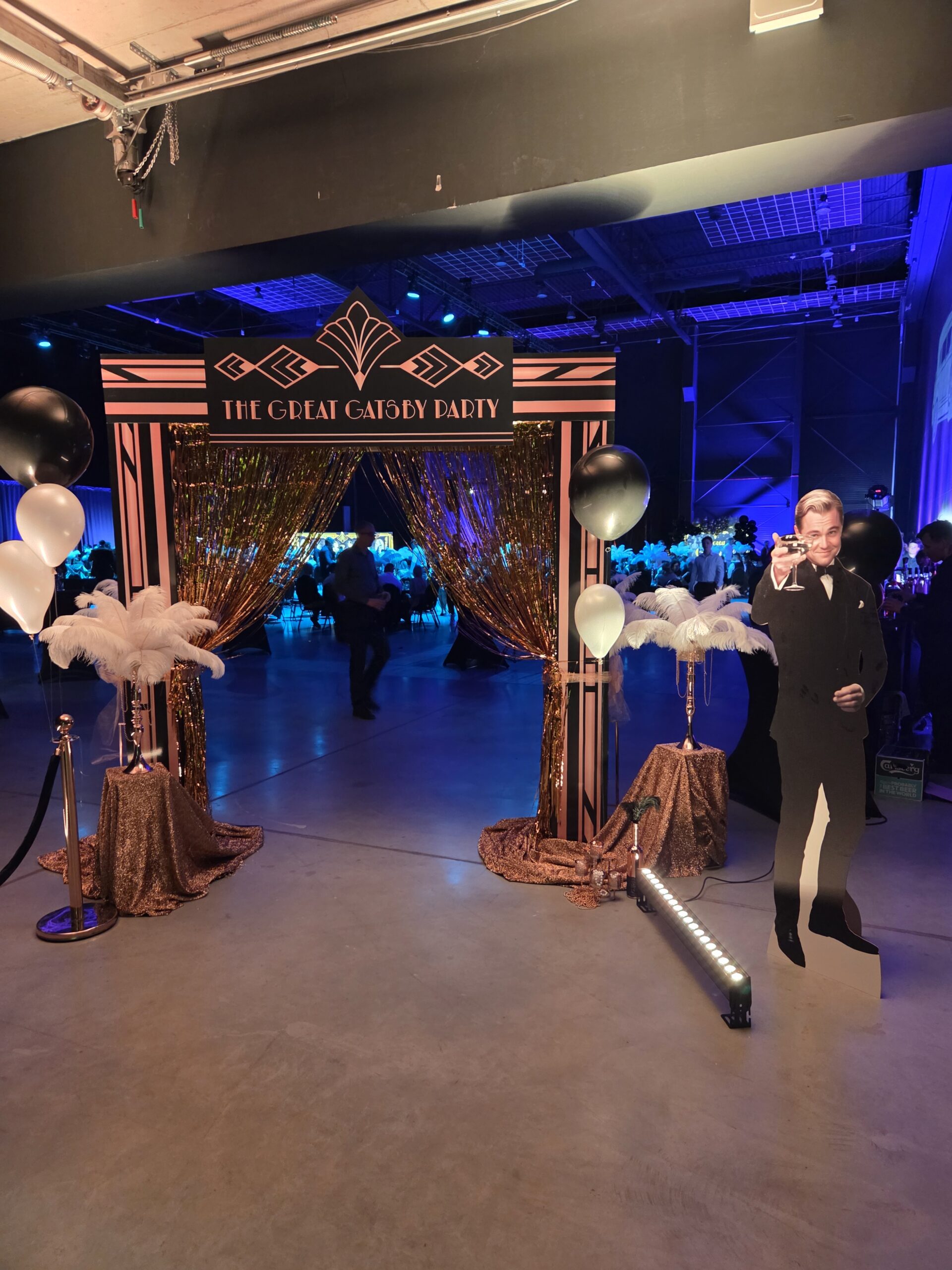Już od pierwszych kroków było jasne, że to nie będzie zwykły event. Gości witał sam Jay Gatsby, elegancki i charyzmatyczny, jakby właśnie wyszedł ze swojej legendarnej posiadłości. Jego obecność nie była przypadkowa, stanowiła zapowiedź wieczoru, w którym każdy detal miał znaczenie, a klimat budowany był od pierwszej sekundy. Przekroczenie złotej bramy stawało się symbolicznym wejściem do innej epoki, świata, gdzie królują styl, szyk oraz odrobina szaleństwa. Towarzyszące temu światło, subtelne refleksy złota oraz starannie dobrane elementy scenografii sprawiały, że goście niemal natychmiast odrywali się od codzienności. Już w strefie wejścia wyczuwalna była atmosfera ekskluzywnego przyjęcia, pełnego elegancji i niedopowiedzianych historii, które dopiero miały się wydarzyć.